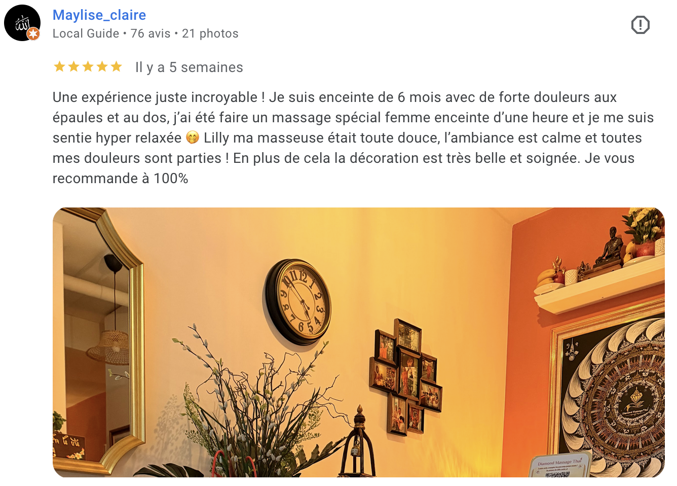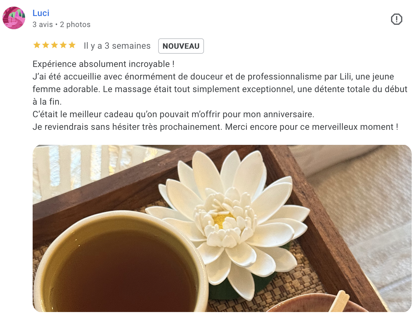 Le massage a non seulement apaisé mon corps, mais aussi mon esprit. Je recommande vivement cet endroit à tous ceux qui cherchent une véritable évasion."