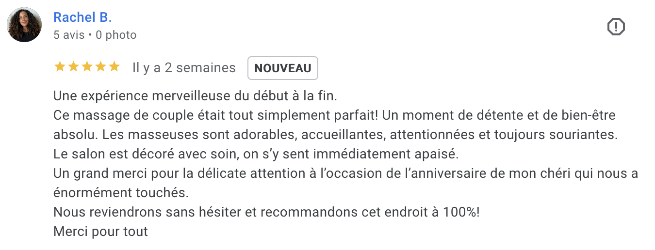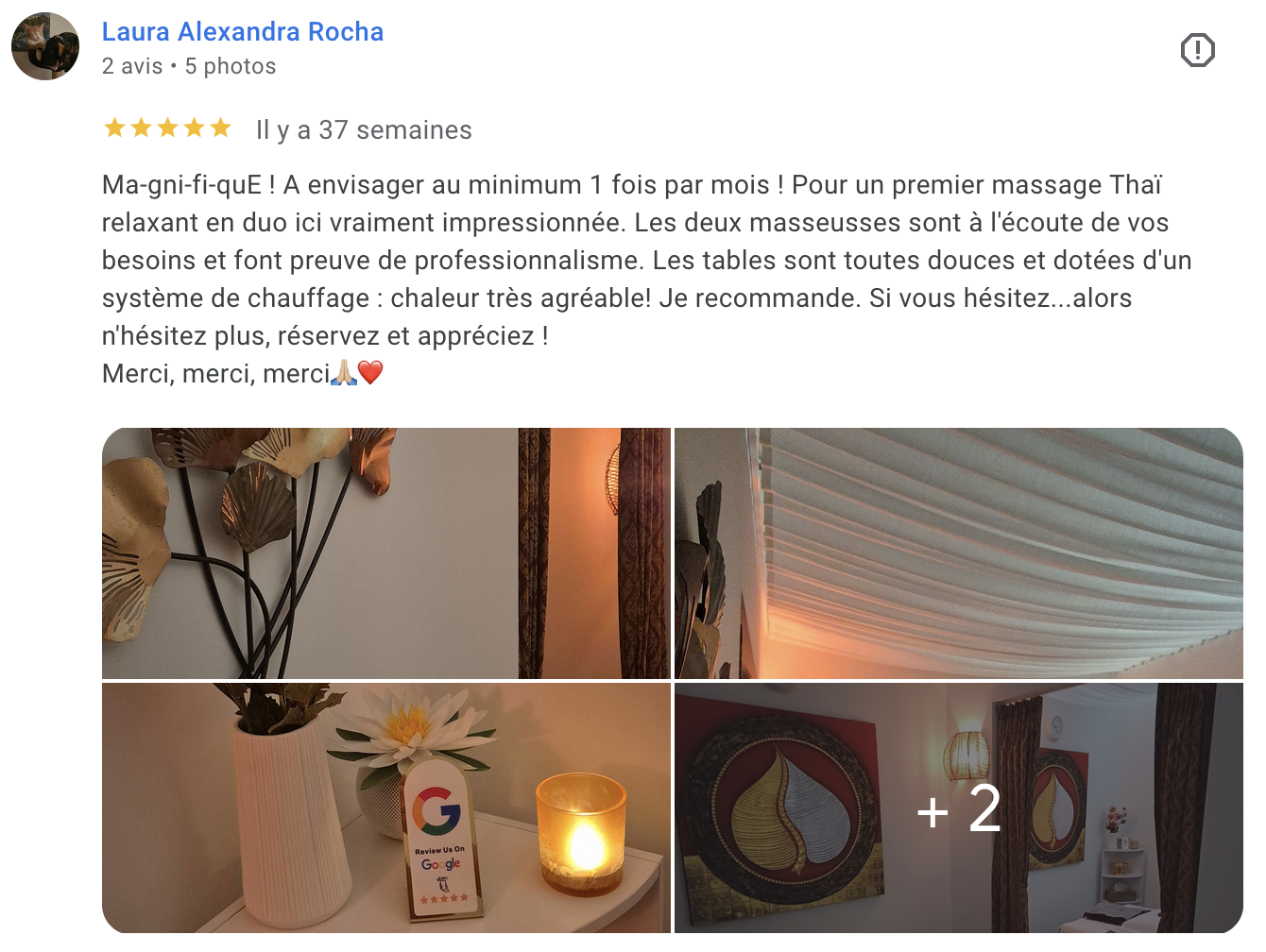 Chaque séance est une nouvelle opportunité de détente et de bien-être. Les masseuses sont extrêmement compétentes et attentifs à nos besoins. Un vrai refuge pour se ressourcer."